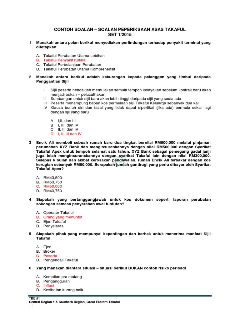 Contoh Soalan Tbe Set 1 Pdf Contoh Soalan U2013 Soalan Peperiksaan Asas Takaful Set 1 2015 1 Manakah Antara Pelan Berikut Menyediakan Perlindungan Course Hero